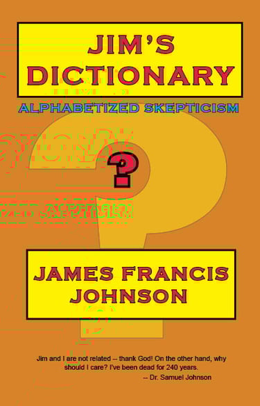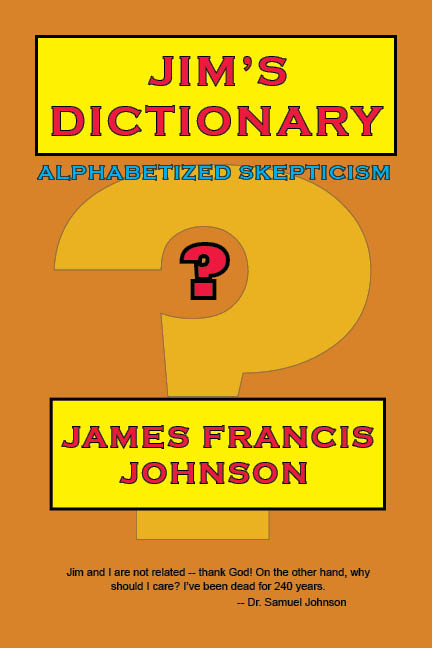 In the tradition of famed lexicographers, Samuel Johnson and Ambrose Bierce, comes James Francis Johnson, ready to give his spiritual ancestors a run for their cynical money. In this volume of Alphabetized Pessimism, the reader will discover words that take on a whole new meaning, literally, for example when Jim defines “Recognition” as “Given to a man who grows a handlebar mustache.” Jim’s Dictionary is the ultimate leave-it-on-a-shelf-beside-the-toilet book, with its short, digestible entries. It may even encourage one to loiter a few extra minutes on the commode, which, in a one-bathroom house, may cause problems in the family. Then again, according to Jim, what is a family but a “collection of forced friendships, some of which fail?” ‘Nuff said.